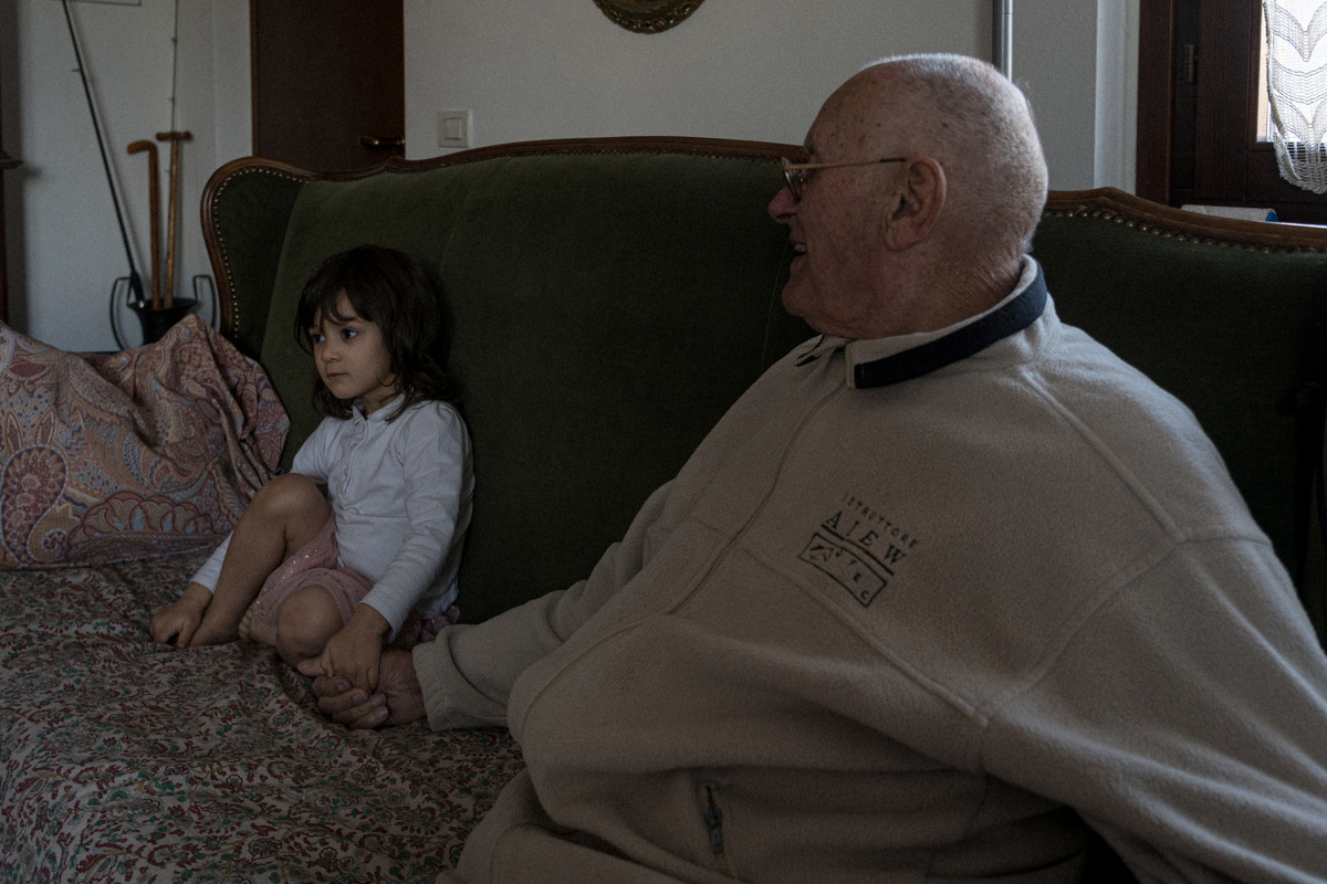 Life inside a red zone: Two-year-old Bianca Toniolo holds hands with her great-grandfather, Gino Verani, 87, as they watch news on television about the coronavirus outbreak at home in San Fiorano, one of the towns on lockdown in northern Italy. The family was concerned about Bianca as she looked as though she may be getting a temperature, but after testing the reading multiple times with several different thermometers, no temperature was recorded. This picture was taken by Bianca's father, schoolteacher Marzio Toniolo, March 4, 2020. Marzio Toniolo/via REUTERS
