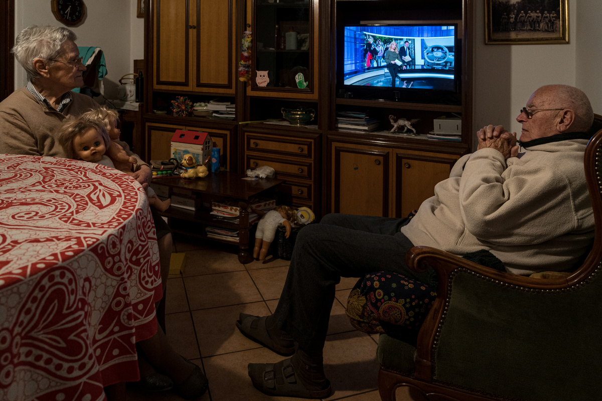 Life inside a red zone: Ines Prandini, 85, watches news on the television of the latest developments of Italy's coronavirus crisis, while her husband Gino Verani, 87, looks on, at home in San Fiorano, one of the towns on lockdown in northern Italy, in this picture taken by their grandson, schoolteacher Marzio Toniolo, March 4, 2020. Marzio Toniolo/via REUTERS