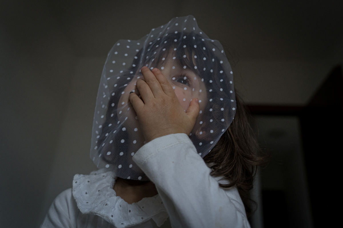 Life inside a red zone: Two-year-old Bianca Toniolo plays with a piece of material to distract her from being in quarantine at home in San Fiorano, one of the towns on lockdown in northern Italy due to a coronavirus outbreak. The family was concerned about Bianca as she looked as though she may be getting a temperature, but after testing the reading multiple times with several different thermometers, no temperature was recorded. This picture was taken by her father, schoolteacher Marzio Toniolo, March 3, 2020. Marzio Toniolo/via REUTERS