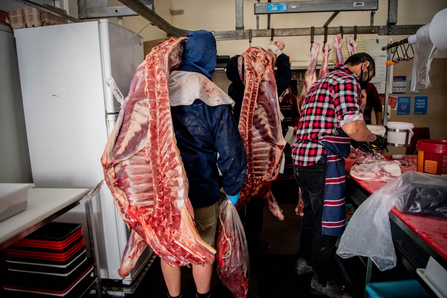 The cutting room is already running at full throttle as the meat is strung up, and while one delivery comes in, several others are packed to go out.