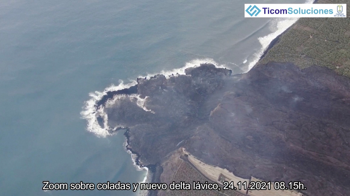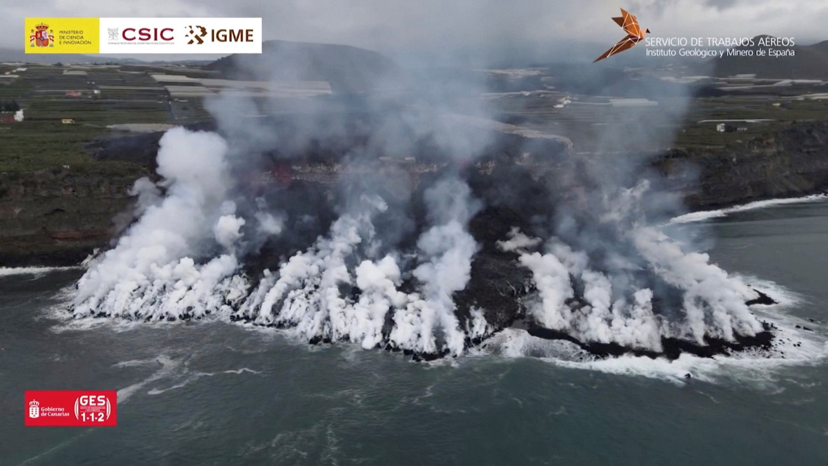 The lava solidifying as it crashes into the water has expanded the island's surface by some 46 hectares, according to the authorities.