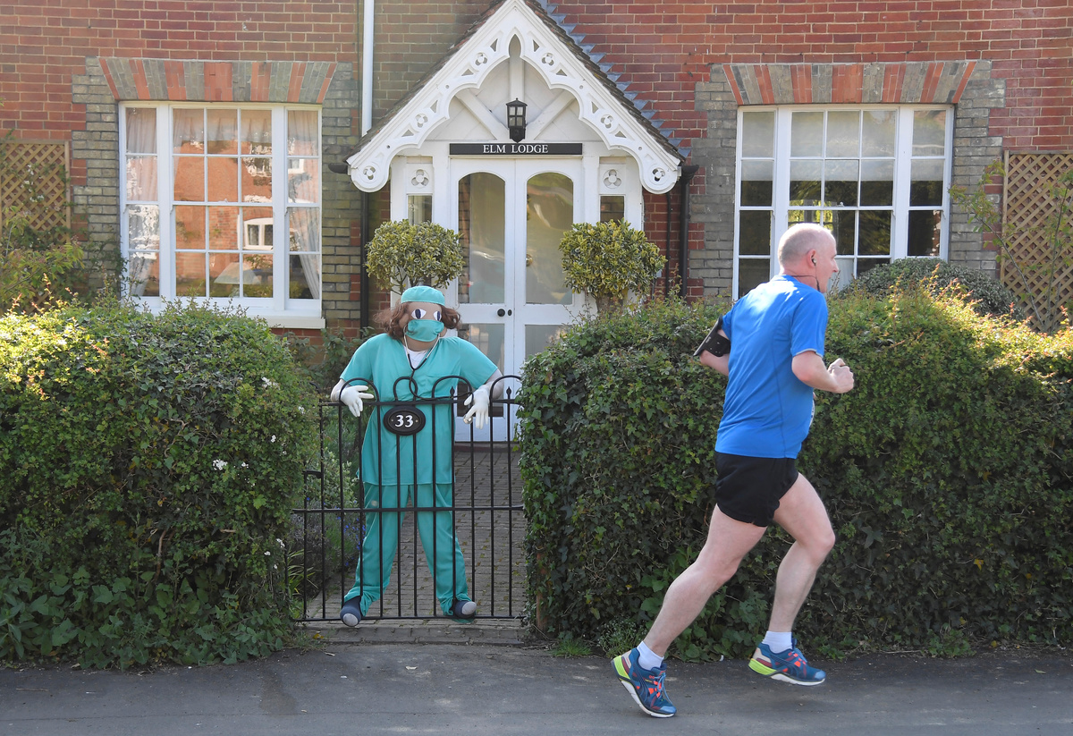 A man runs past a figure representing a key worker in a front garden as various scarecrows lighten the daily lockdown walk, as the number of coronavirus disease cases (COVID-19) grows around the world, in the village of Capel in southern Britain, April 26, 2020. REUTERS/Toby Melville