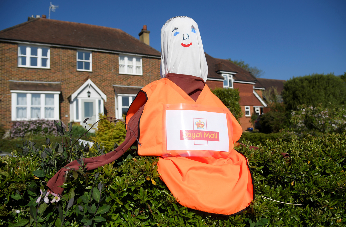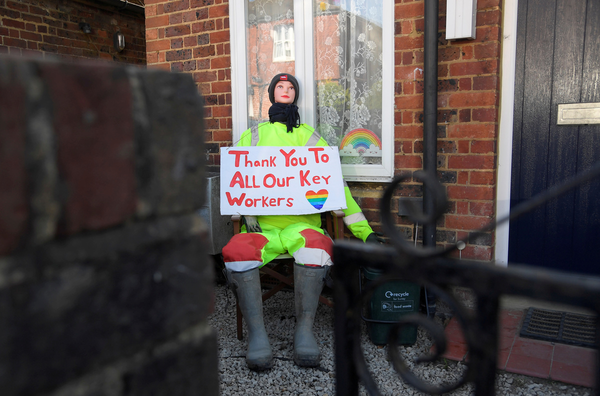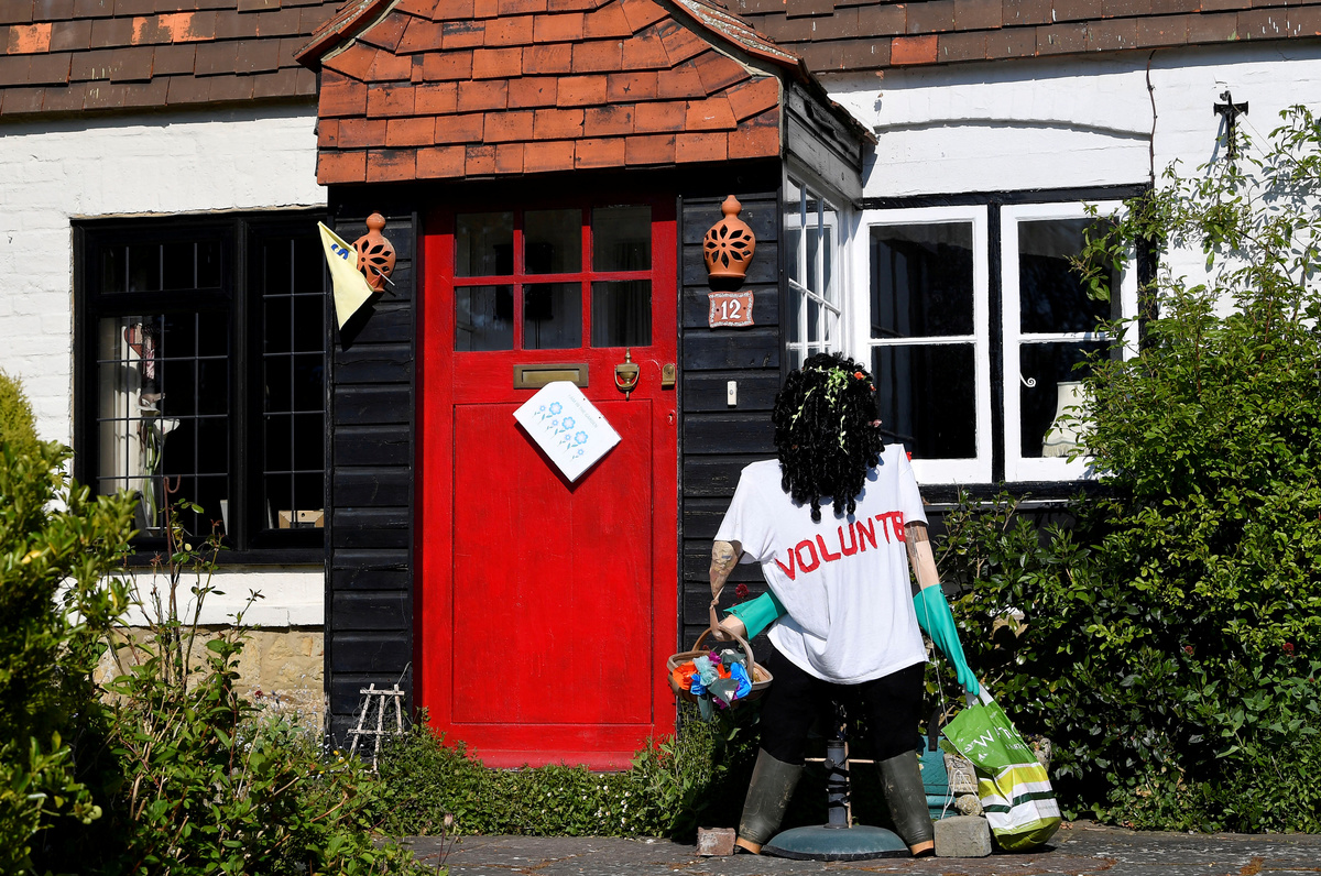 A figure representing a key worker is seen in a front garden as various scarecrows lighten the daily lockdown walk, as the number of the coronavirus disease cases (COVID-19) grows around the world, in the village of Capel in southern Britain, April 26, 2020. REUTERS/Toby Melville