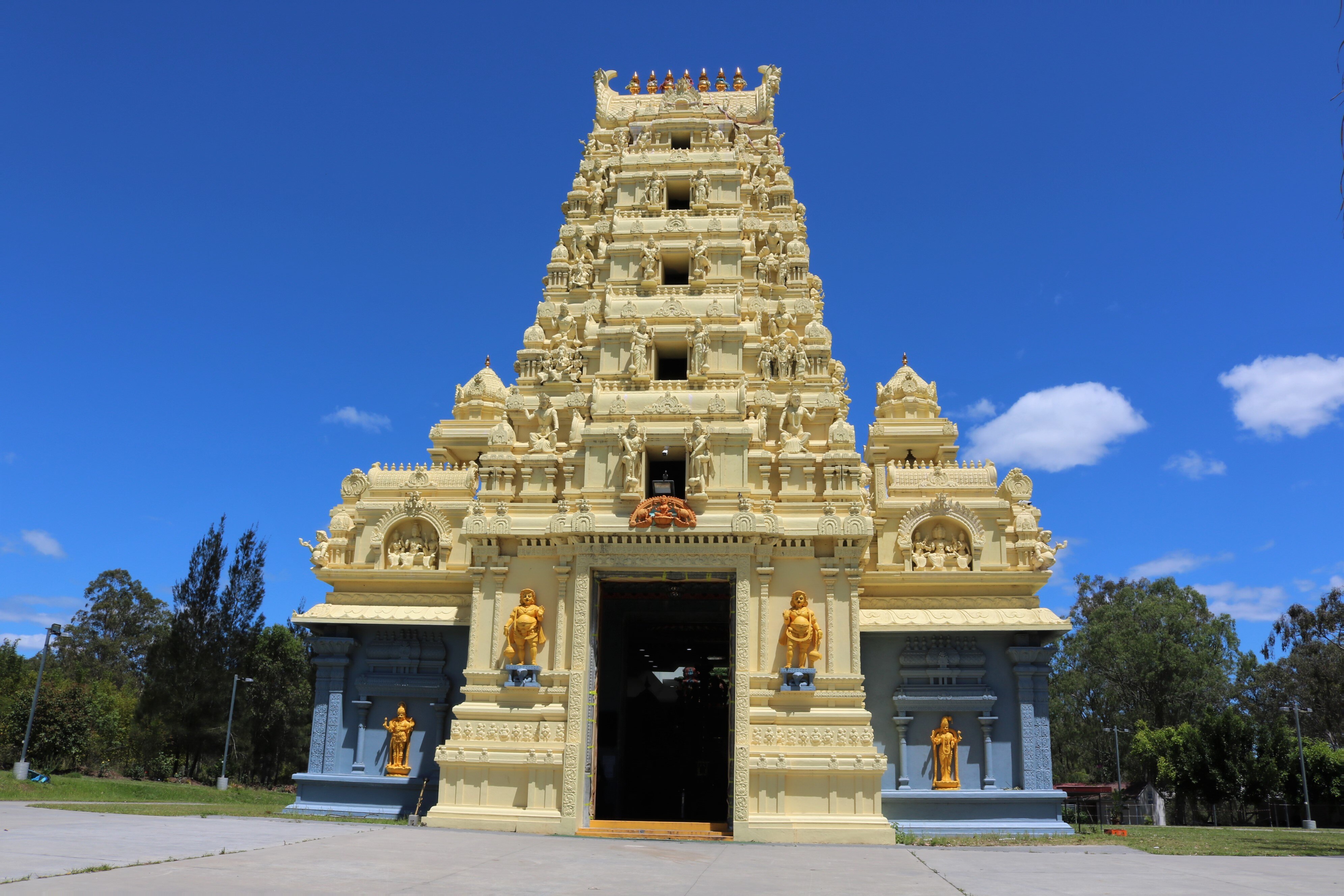 The yellow spire of the Sri Selva Vinayakar temple flashes past in an instant, rising out of the trees in a bright moment of unexpected beauty on the workmanlike Mount Lindsay Highway, on the south side of Logan.