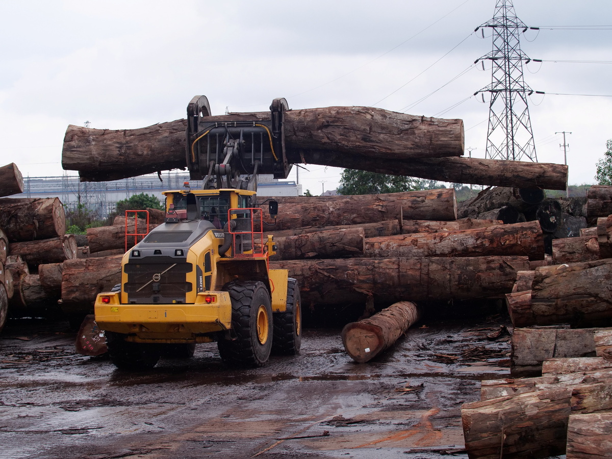 The wood's legal credentials are checked before it is stacked for processing. Some trunks are turned into planks and plywood sheets, others into high-end furniture.