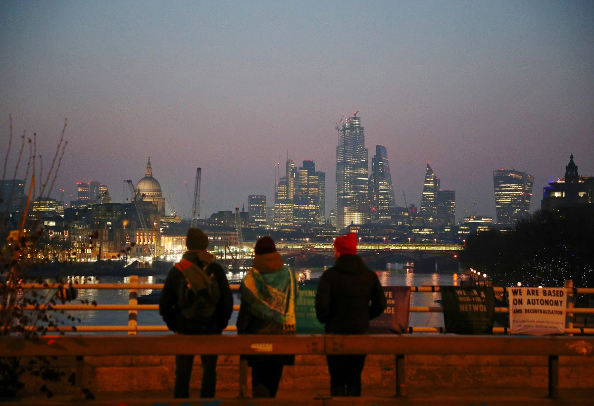 LONDON (Reuters) - Two environmental activists climbed onto the roof of a train in London's Canary Wharf financial district on Wednesday as part of a third day of action to force Britain to take more radical measures to avert climate change.