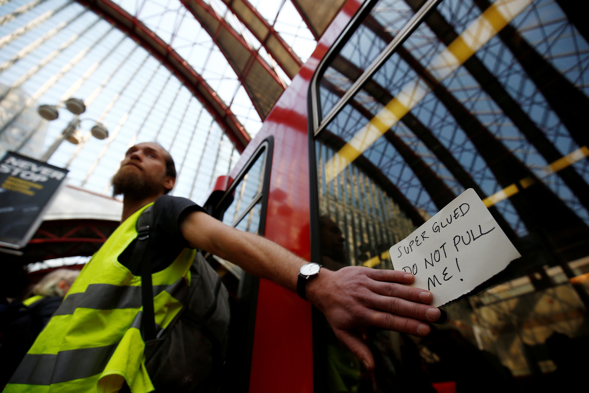 Some passengers shouted at the pair to get off whilst police headed for the scene. Another activist glued himself to one of the trains.
