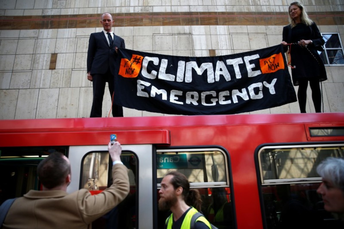 A man dressed in a dark suit and a woman wearing a black jacket stood on the roof of a train at the Docklands Light Railway (DLR) station in Canary Wharf, holding a banner which read: "Climate Emergency. Act Now."
