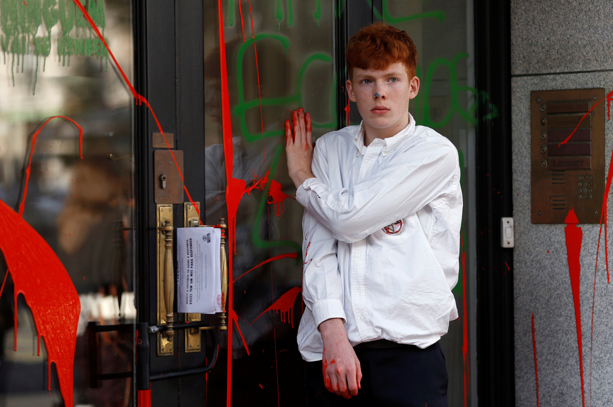 LONDON (Reuters) - Climate-change protesters threw red paint at the Brazilian embassy in London on Tuesday to demonstrate against damage to the Amazon rainforest and what they described as violence against indigenous tribes living there.