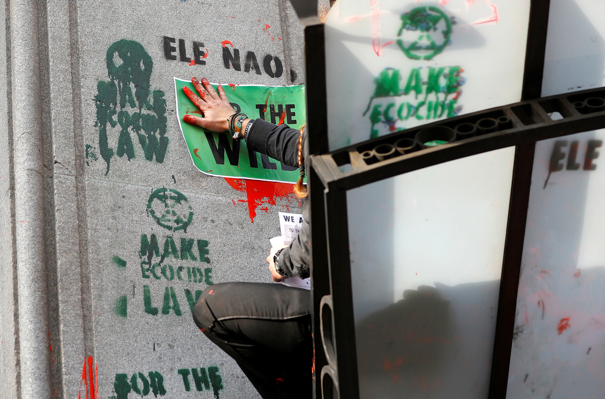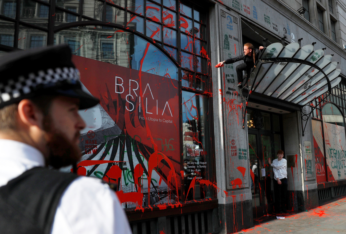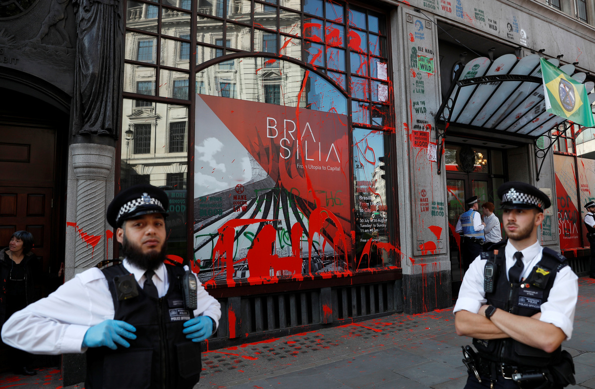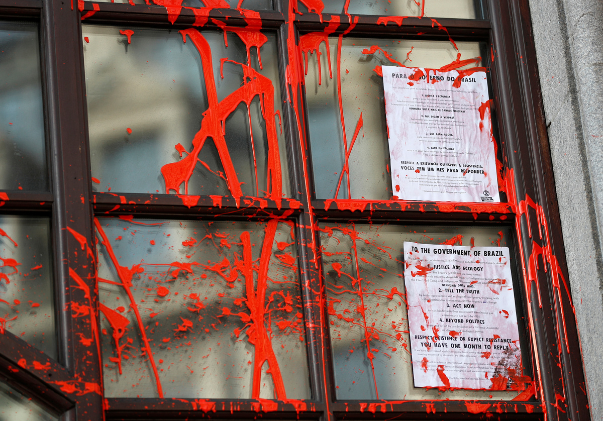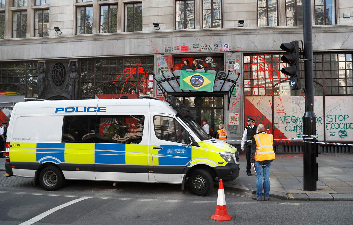 The Brazilian embassy in London said in response to Extinction Rebellion's actions that it welcomed anyone wishing to establish a dialogue about Brazil's public policies, but the right to vandalize property did not exist in any country.