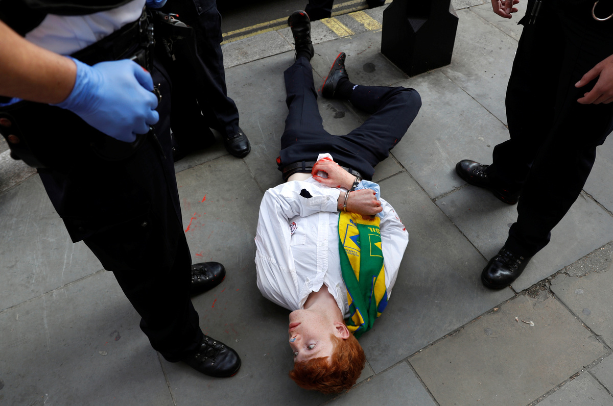 Extinction Rebellion said the protest in London was timed to coincide with a march by indigenous women in Brasilia on Tuesday, and that similar actions were taking place at Brazilian embassies in Chile, Portugal, France, Switzerland and Spain.
