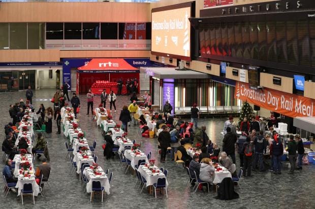 Volunteers from Network Rail and charity workers decked out the concourse, which would otherwise have been empty as no trains were running, before laying on a festive feast.