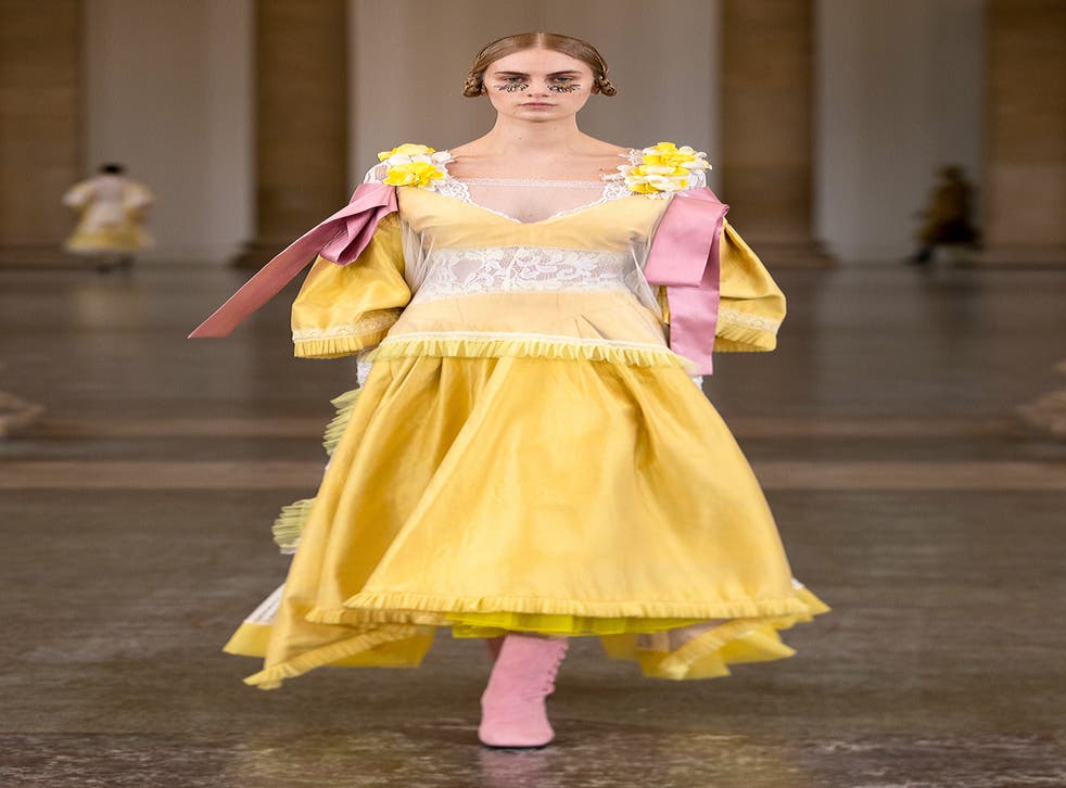 In what is one of the few live-streamed fashion shows of the season, models floated through the bare walls of the British landmark to the sonorous sounds of musician Alison Sudol in an array of ethereal Victorian smocks, complete with high-necks, frilled hems, and layers upon layers of frothy tulle. Colour-wise, Aksu sought to uplift through a palette of yolk yellows, buttercreams, and pastel pinks, paying homage to that childlike breed of creativity that we’ve all had more time to indulge this year.