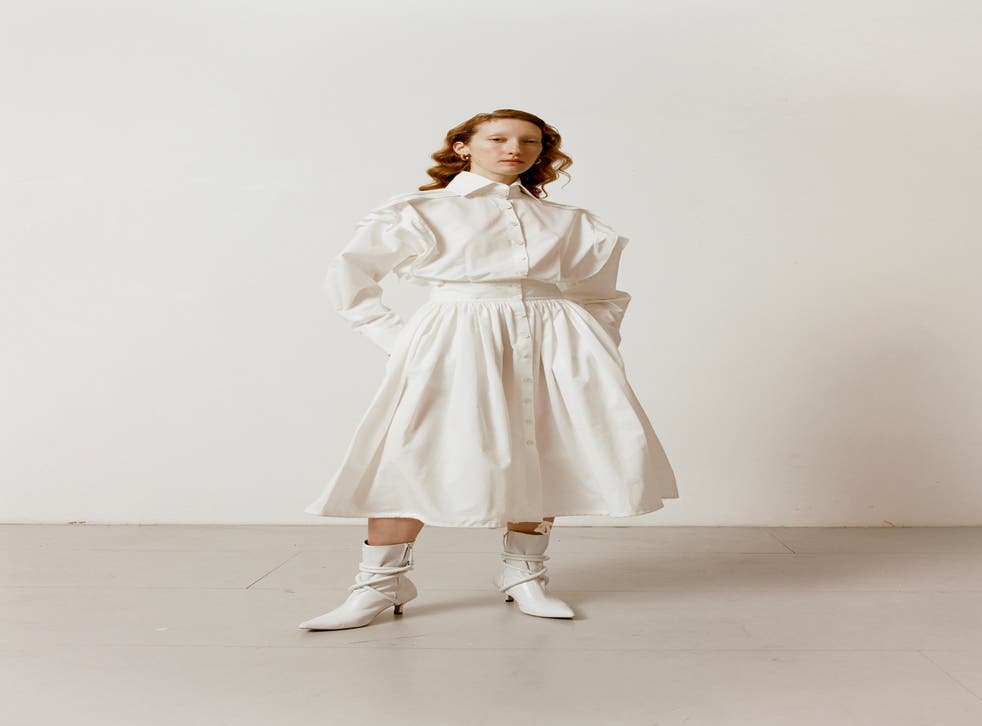 Proceedings kicked off with a masterclass in minimalism at palmer//harding, whose autumn/winter 2021 collection was inspired by “the emotions of falling in love”. It’s a subtle message, one that has woven itself into delicate rope-tie dresses and smock-like shirting that conjures up an image of the kind of clothing worn by garment workers in the 18th century, when romance revolved around courting – an archaic dating ritual that has had an unlikely resurgence due to lockdown restrictions imposed during the pandemic.