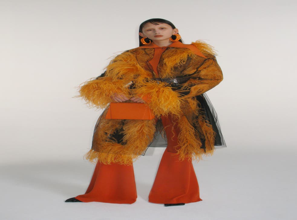 This idea of entrapment felt prescient given the current climate, and 16Arlington’s autumn/winter collection draws on this by covering its signature ostrich feathers in delicate netting on several pieces, including a show-stopping burnt orange coat complete with feather trimming and a black mesh overlay. Elsewhere, there were equally flamboyant creations in the form of a leather and marabou gown, ginormous puffa coats, and cobalt blue patent leather pencil skirts.