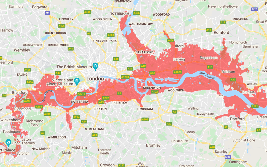 This map shows the areas of London that face regular flooding by 2030 as extreme weather becomes more common because of the climate crisis.