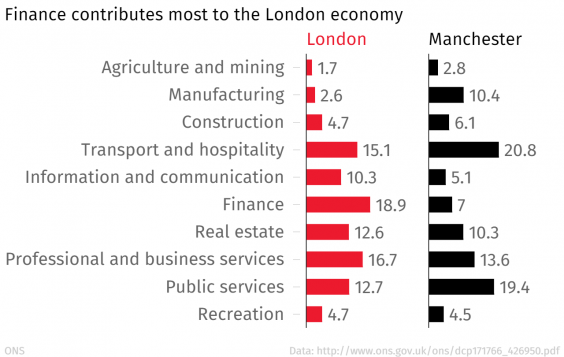 Manchester, where the economy has grown half as fast since 2009, relies far more heavily on manufacturing, transport and hospitality than finance or real estate.