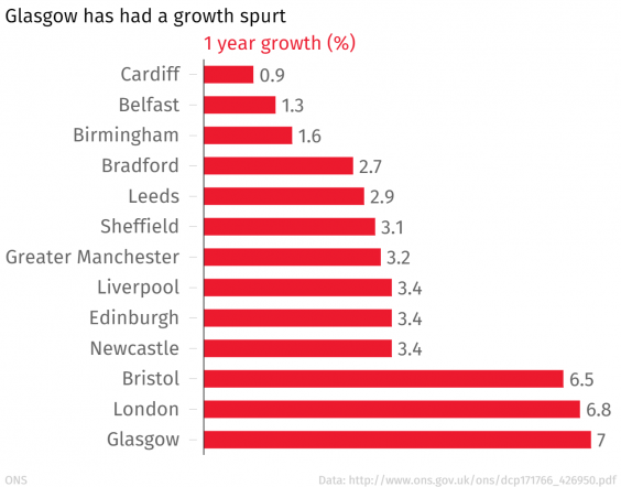 If we look at growth over the period 2013-14, we can see that Glasgow's economy was the fastest growing in the UK.