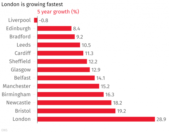 Since the financial crisis, London's economy grew by 28.9 per cent - almost twice the rate of Leeds or Cardiff.