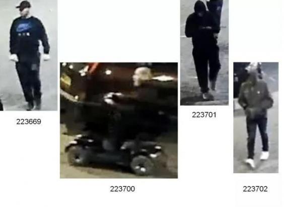 'Suspect 2' is described as a white man with a bald head, wearing dark clothing and driving a dark coloured mobility scooter.