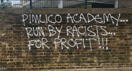 Three sets of wording have been written across the outside of Pimlico Academy’s primary, secondary and sixth form bases in south London which read: “White schools for brown kids – are you mad?’, ‘Pimlico Academy…run by racists…for profit!!!’ and ‘Ain’t no black in the Union Jack…’.