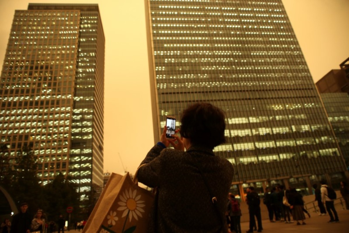 REUTERS/Mary TurnerThe sky turns red over buildings in Canary Wharf as dust from the Sahara carried by storm Ophelia filters sunlight over London, Britain, October 16, 2017. REUTERS/Tom JacobsA woman photograhs buildings in Canary Wharf as the sky turns red as dust from the Sahara carried by storm Ophelia filters sunlight over London, Britain, October 16, 2017. REUTERS/Tom Jacobs