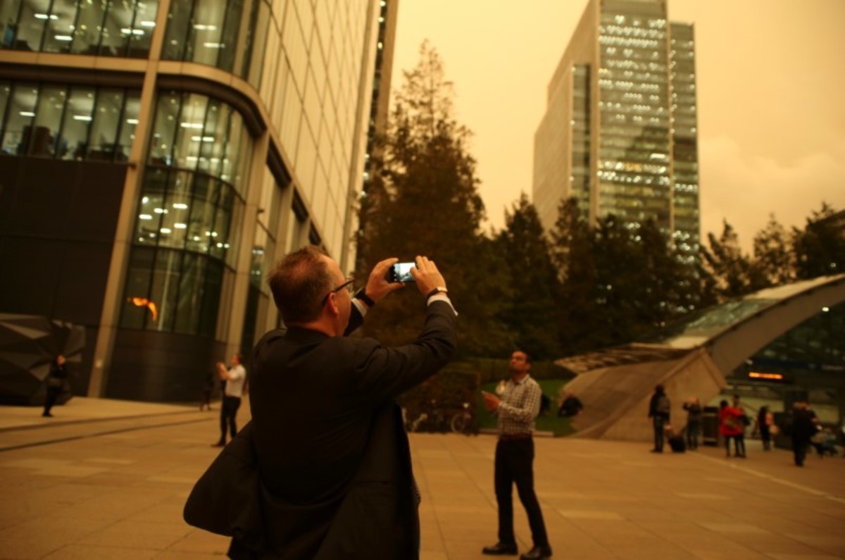 A man photographs the sky turning red over buildings in Canary Wharf as dust from the Sahara carried by storm Ophelia filters sunlight over London. REUTERS/Tom Jacobs