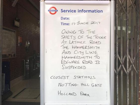 A sign at Ladbroke Grove station said "owing to the safety of the Tower" the lines had been partly suspended.
