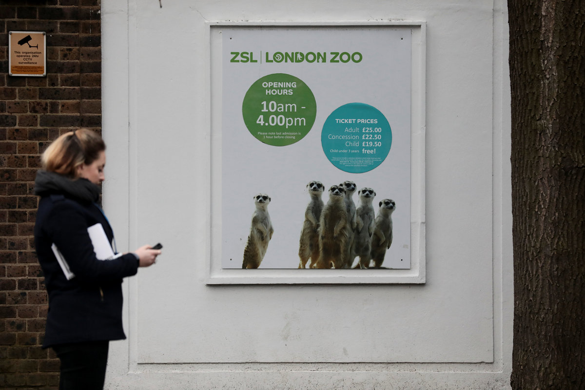 A pedestrian walks past an advertising poster featuring meerkats at London Zoo as it reopens following a fire which broke out at a shop and cafe at the attraction, in central London, Britain December 24, 2017. REUTERS/Simon Dawson