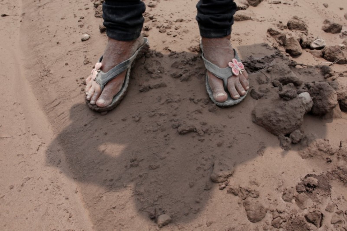 The feet of Eufemia Garcia, 48, who lost 50 members of her family during the eruption of the Fuego volcano, are seen as she searches for her family in San Miguel Los Lotes in Escuintla, Guatemala, June 14, 2018. REUTERS/Carlos Jasso
