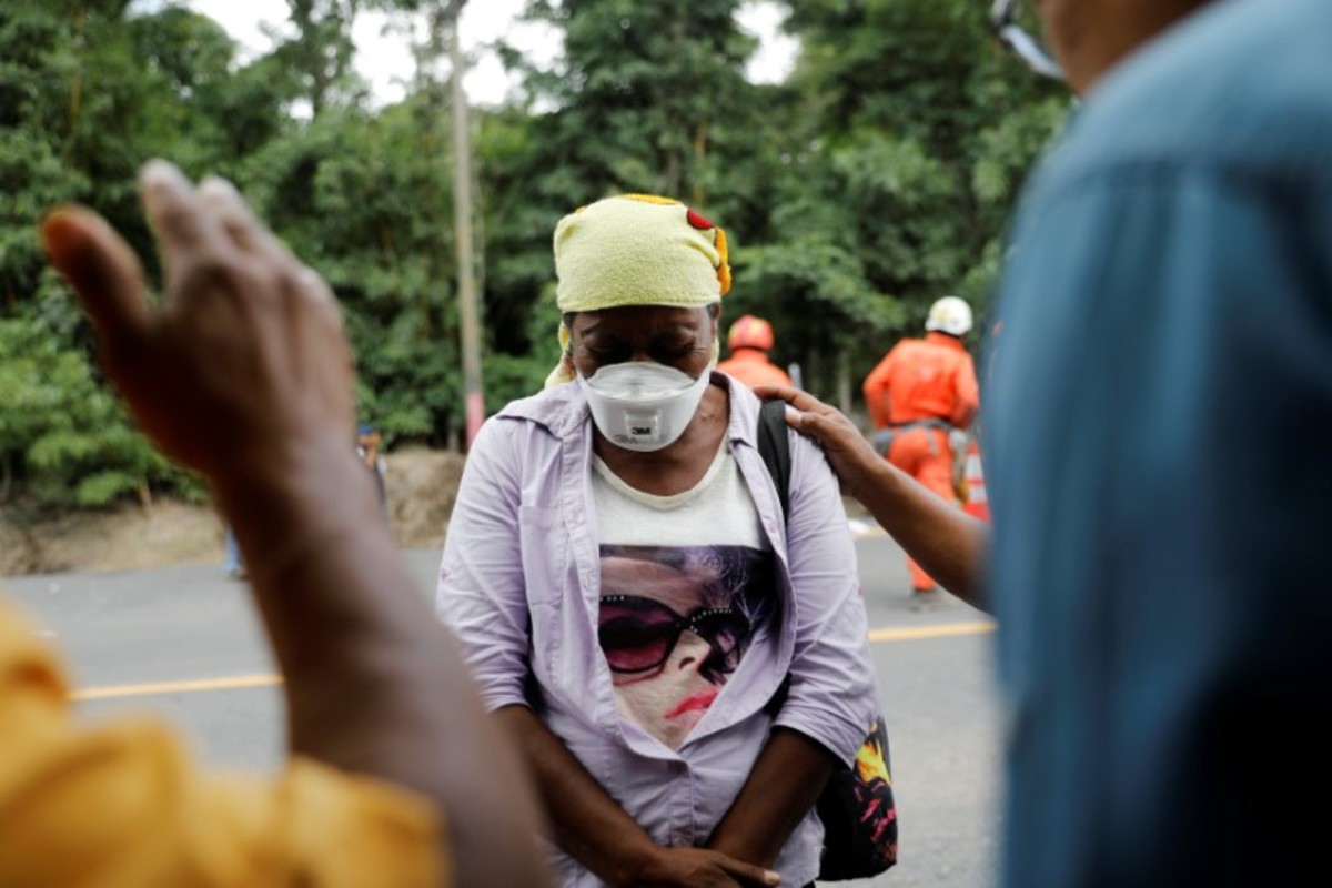 Eufemia Garcia, 48, who lost 50 members of her family during the eruption of the Fuego volcano, is embraced by a rescue worker as she searches for her family in San Miguel Los Lotes in Escuintla, Guatemala, June 15, 2018. REUTERS/Carlos Jasso
