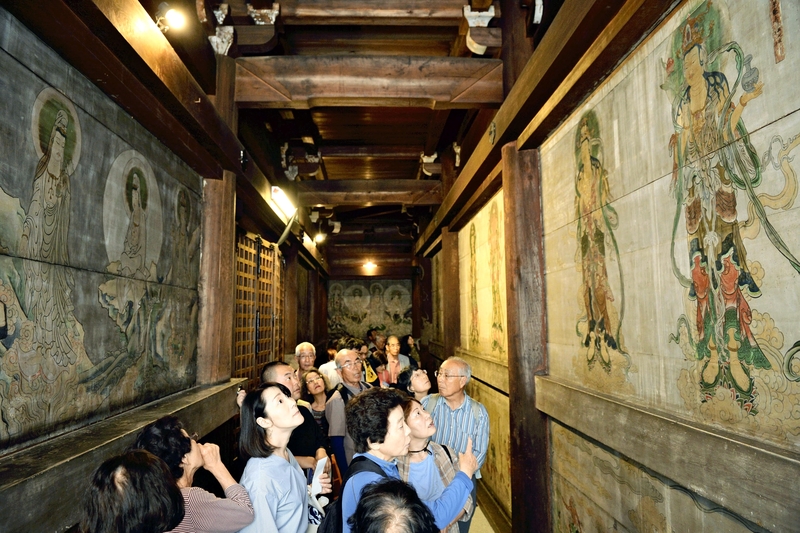 Monks chant sutras before Buddhist statues, including the thousand-armed Kannon Bodhisattva standing statue, in Kannondo hall of Ninnaji temple in Kyoto on Wednesday. The hall underwent a six-year restoration, its first in 370 years, and was specially open to the public the same day. The UNESCO World Hertiage site in Ukyo Ward is connected to the Imperial family.