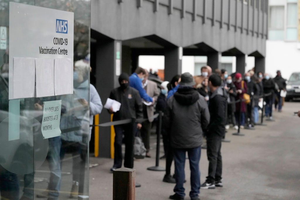 Long lines formed at vaccination centers in Britain on Monday as people heeded the government’s call for all adults to get booster shots to help withstand a coronavirus “tidal wave” driven by the omicron variant.