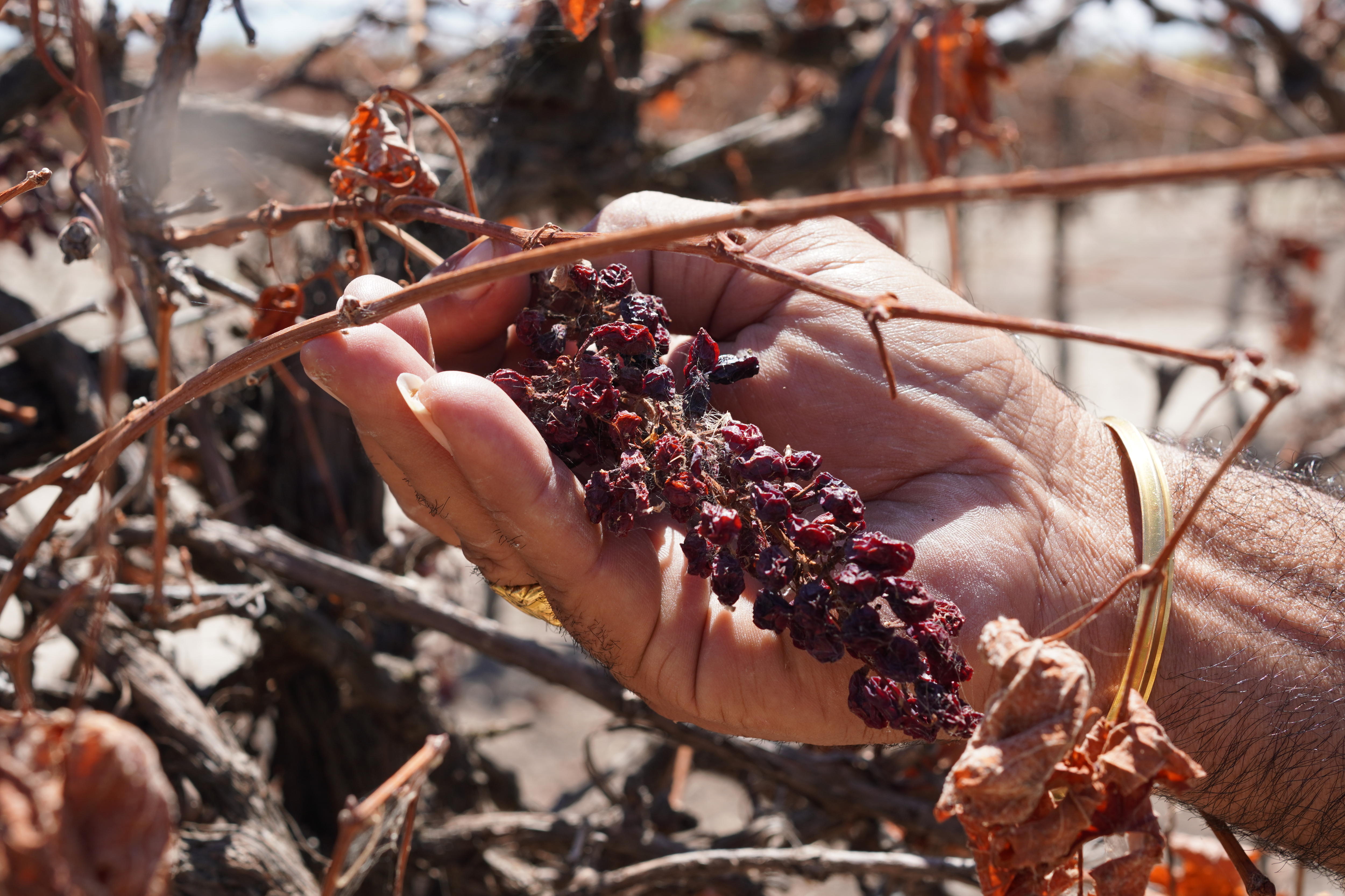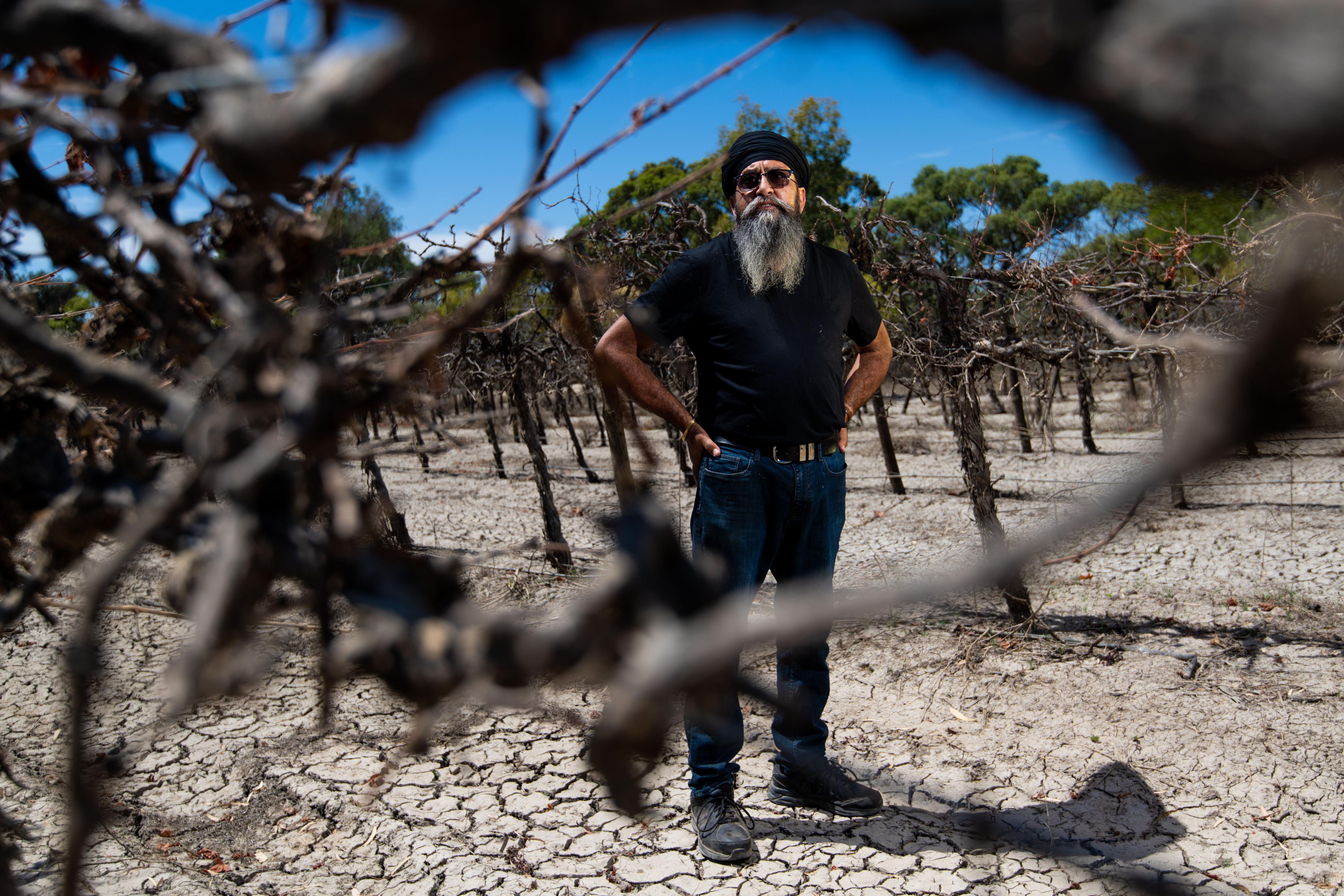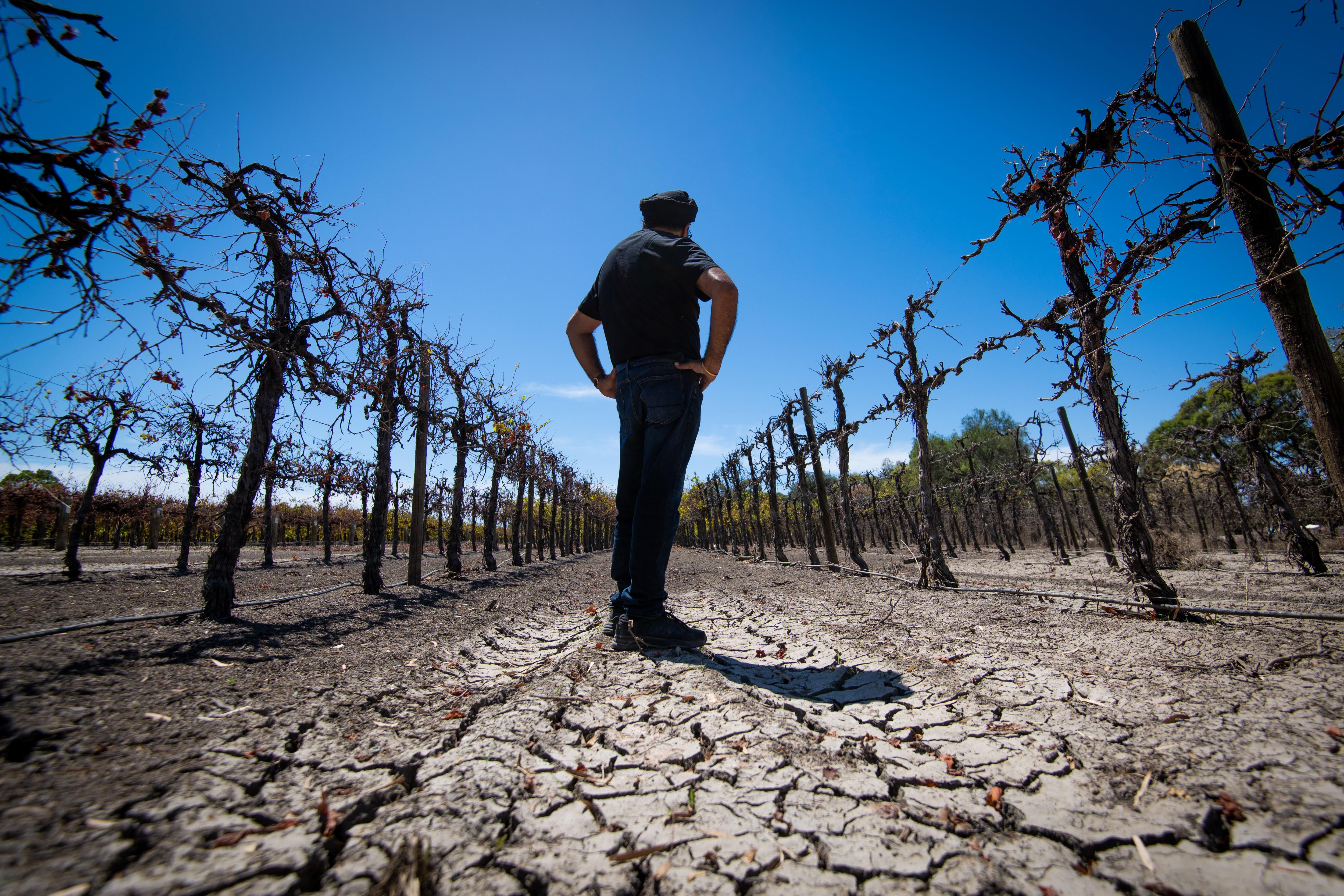 In December his vineyard went underwater, and now the water has receded, he is left with row after row of dead vines.