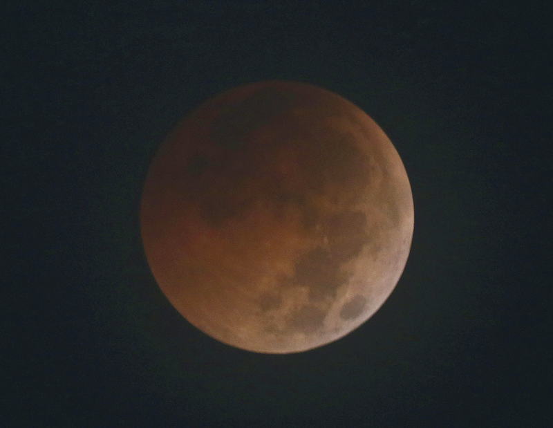 As seen from a hill in the Shurisakiyamacho district in Naha, the full moon began waning from the upper left shortly after 3:20 a.m. The entire moon appeared to fall into the Earth's shadow at about 4:30 a.m., gleaming a soft copper red.