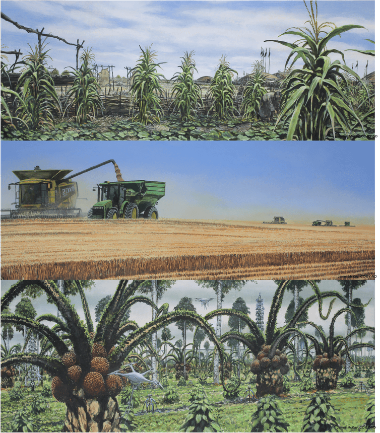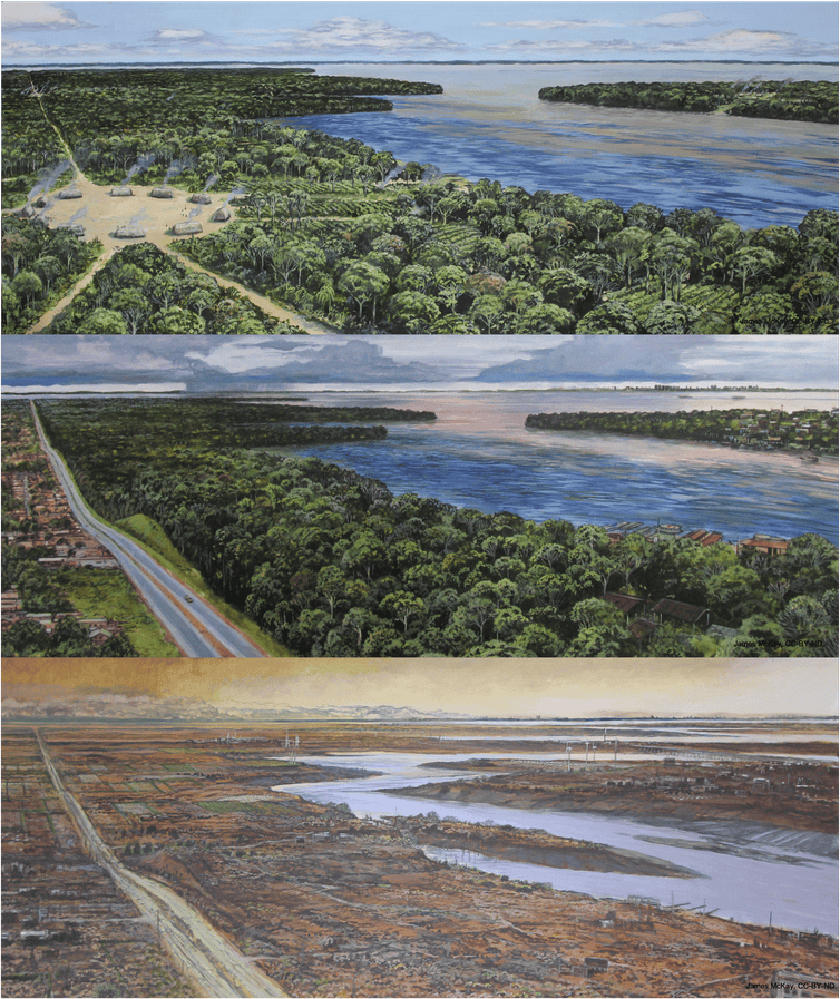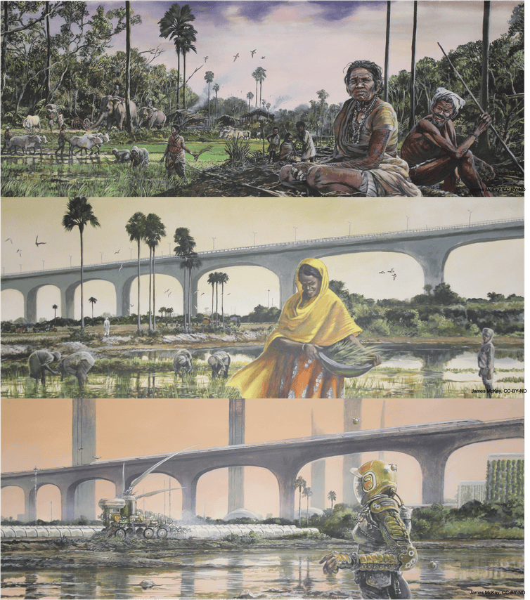 To really portray what a low-mitigation/high-heat world could look like compared to what we’ve experienced until now, we used our projections and diverse research expertise to inform a series of nine paintings covering a thousand years (1500, 2020, and 2500 CE) in three major regional landscapes (the Amazon, the Midwest United States, and the Indian subcontinent). The images for the year 2500 center on the RCP6.0 projections, and include slightly advanced but recognizable versions of today’s technologies.