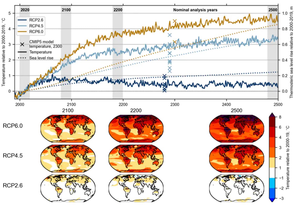 We ran global climate model projections based on Representative Concentration Pathways (RCP), which are “time-dependent projections of atmospheric greenhouse gas (GHG) concentrations.” Our projections modeled low (RCP6.0), medium (RCP4.5), and high mitigation scenarios (RCP2.6, which corresponds to the “well-below 2 degrees Celsius” Paris Agreement goal) up to the year 2500.