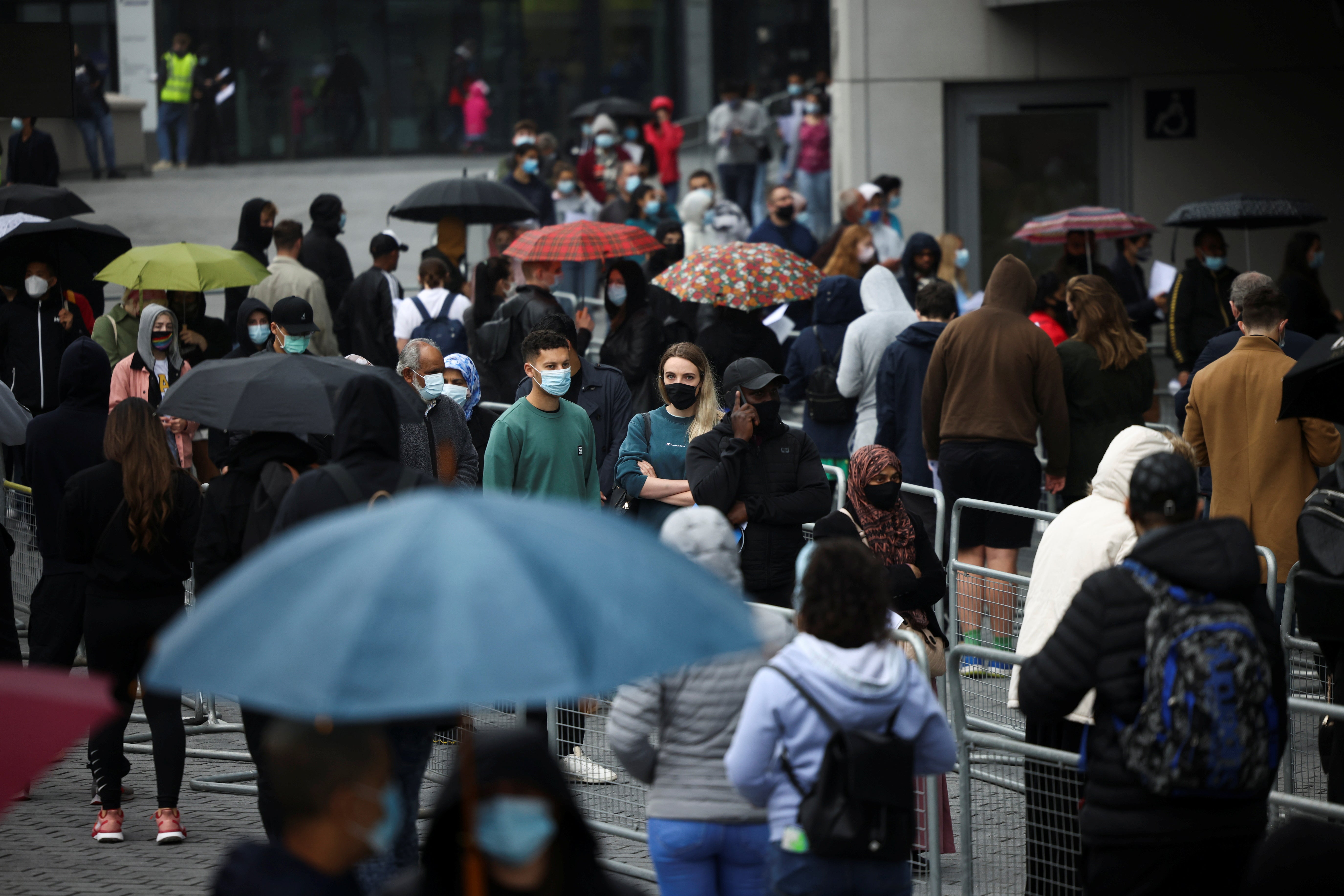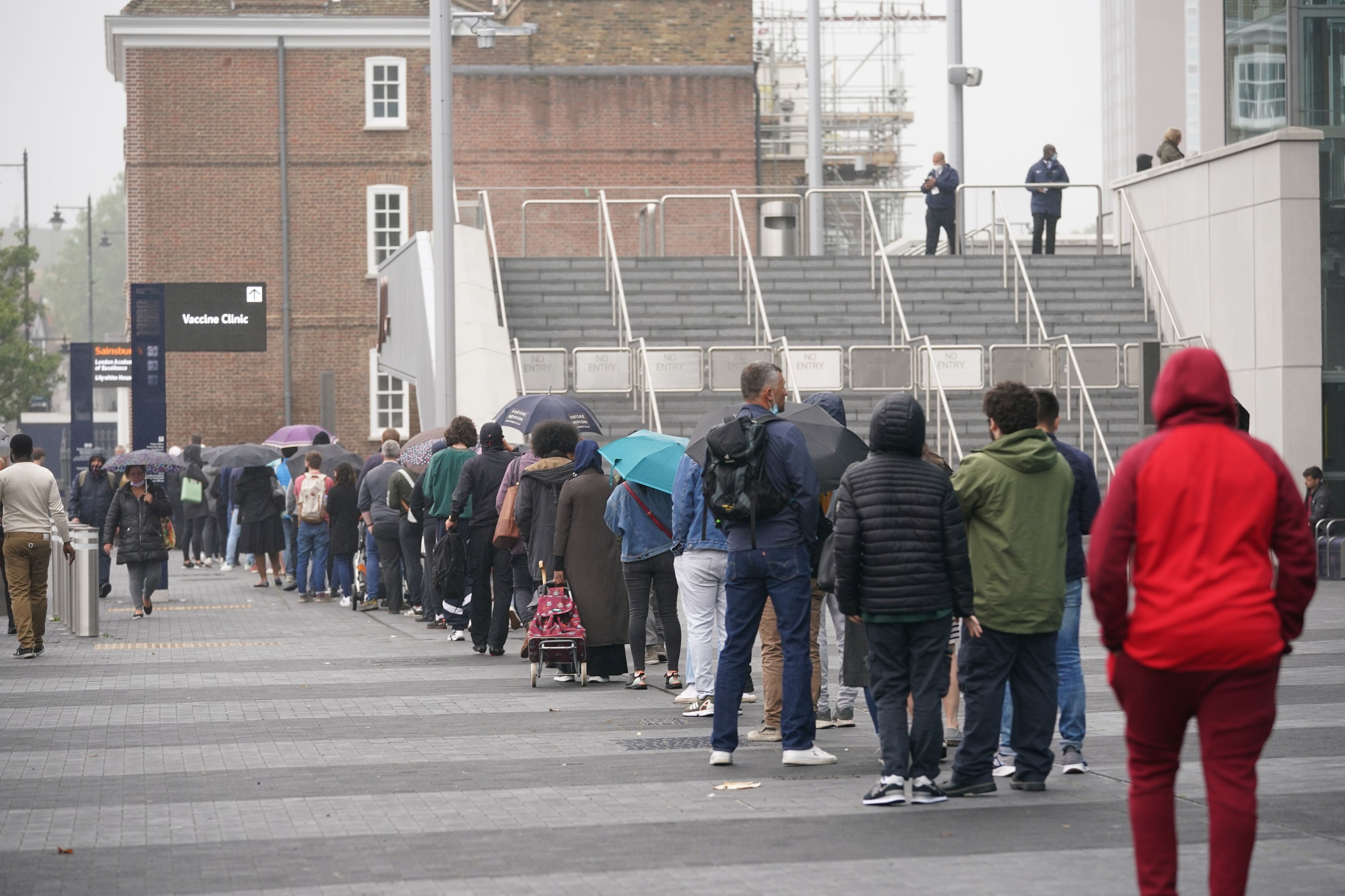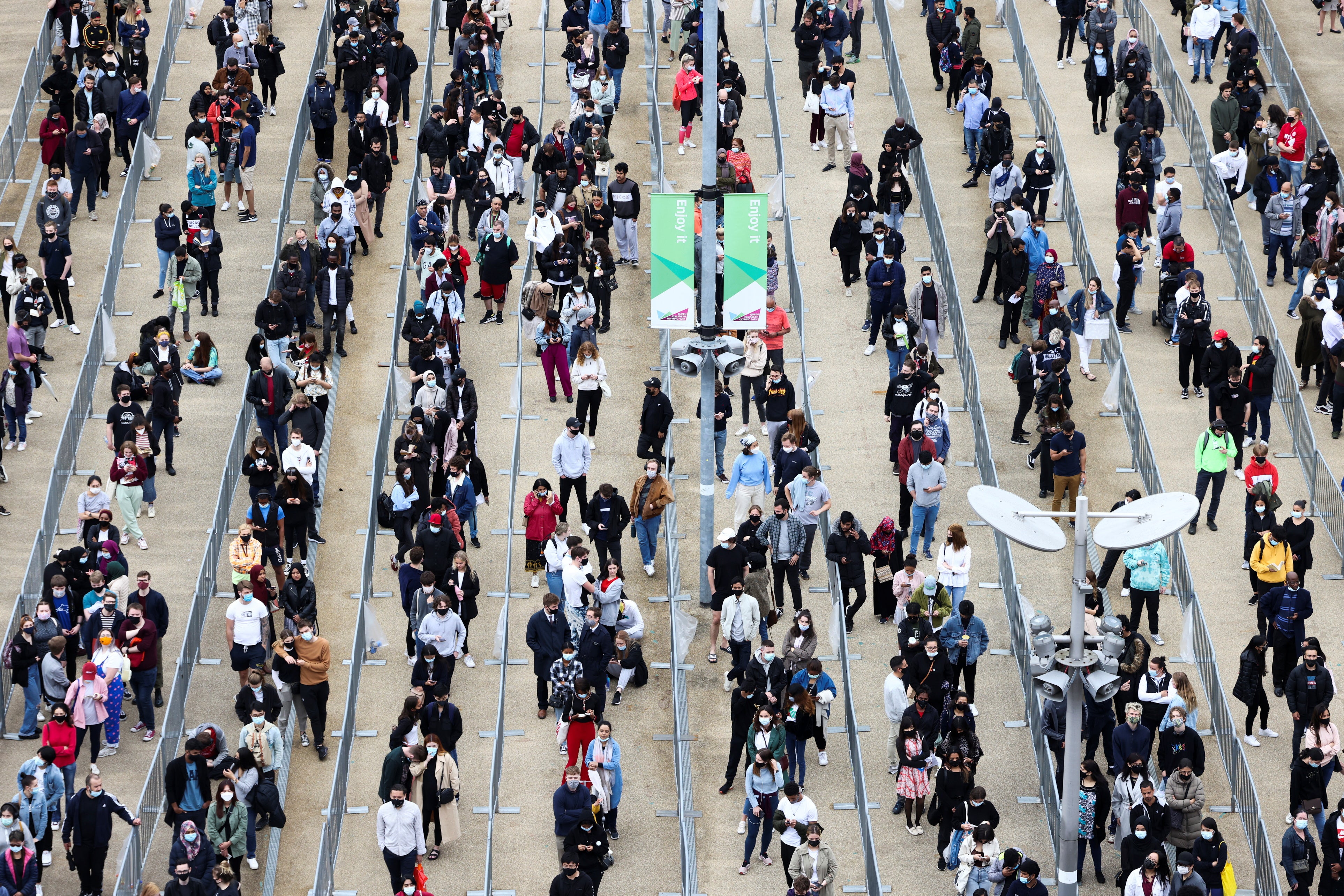 People queue outside a mass vaccination centre for those aged 18 and over at the London Stadium