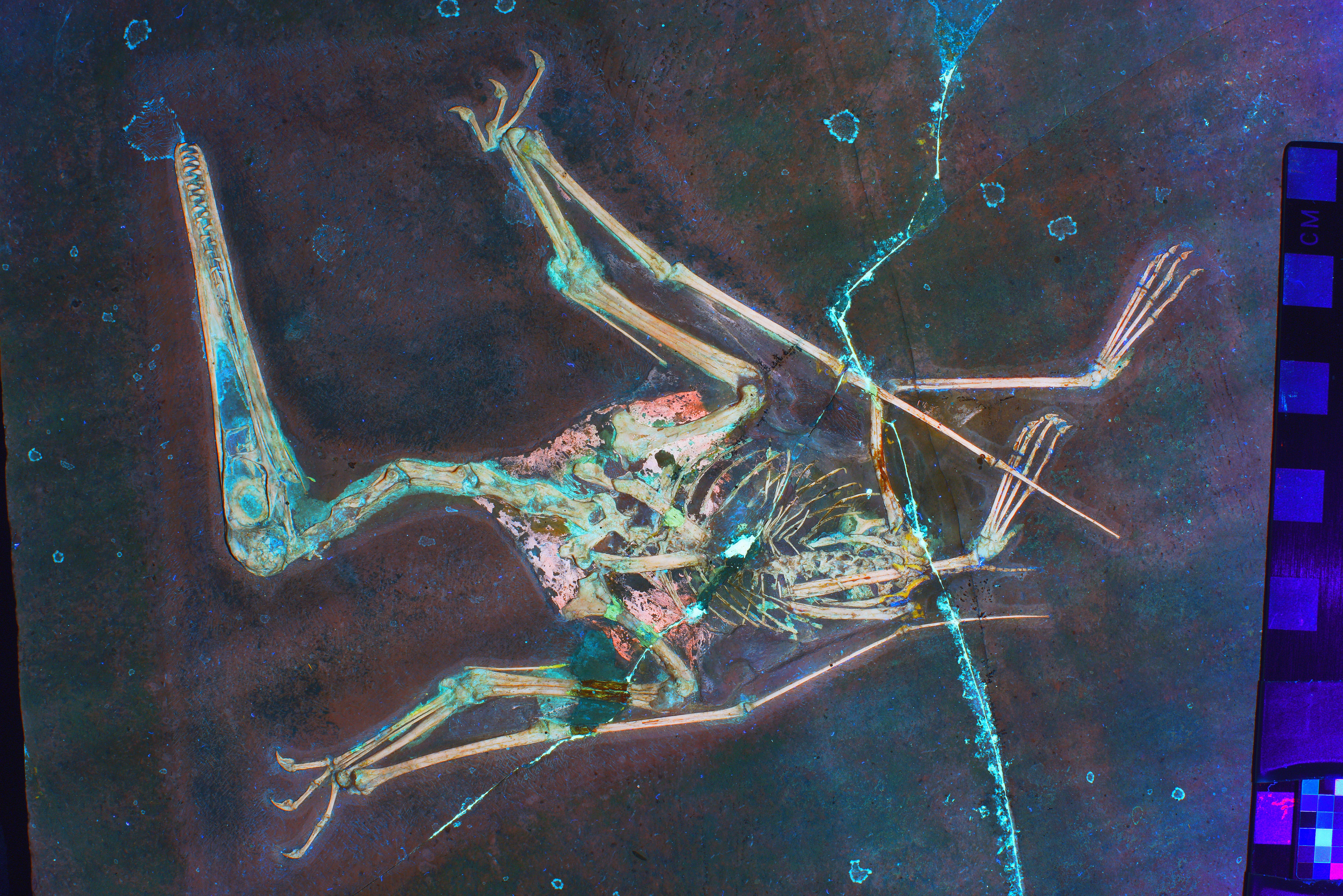 To answer this question, the team used a technique called laser-stimulated fluorescence to help them collect data on the soft tissue and bones of a pterosaur skeleton, which the authors write can appear misleading under full-spectrum white light.