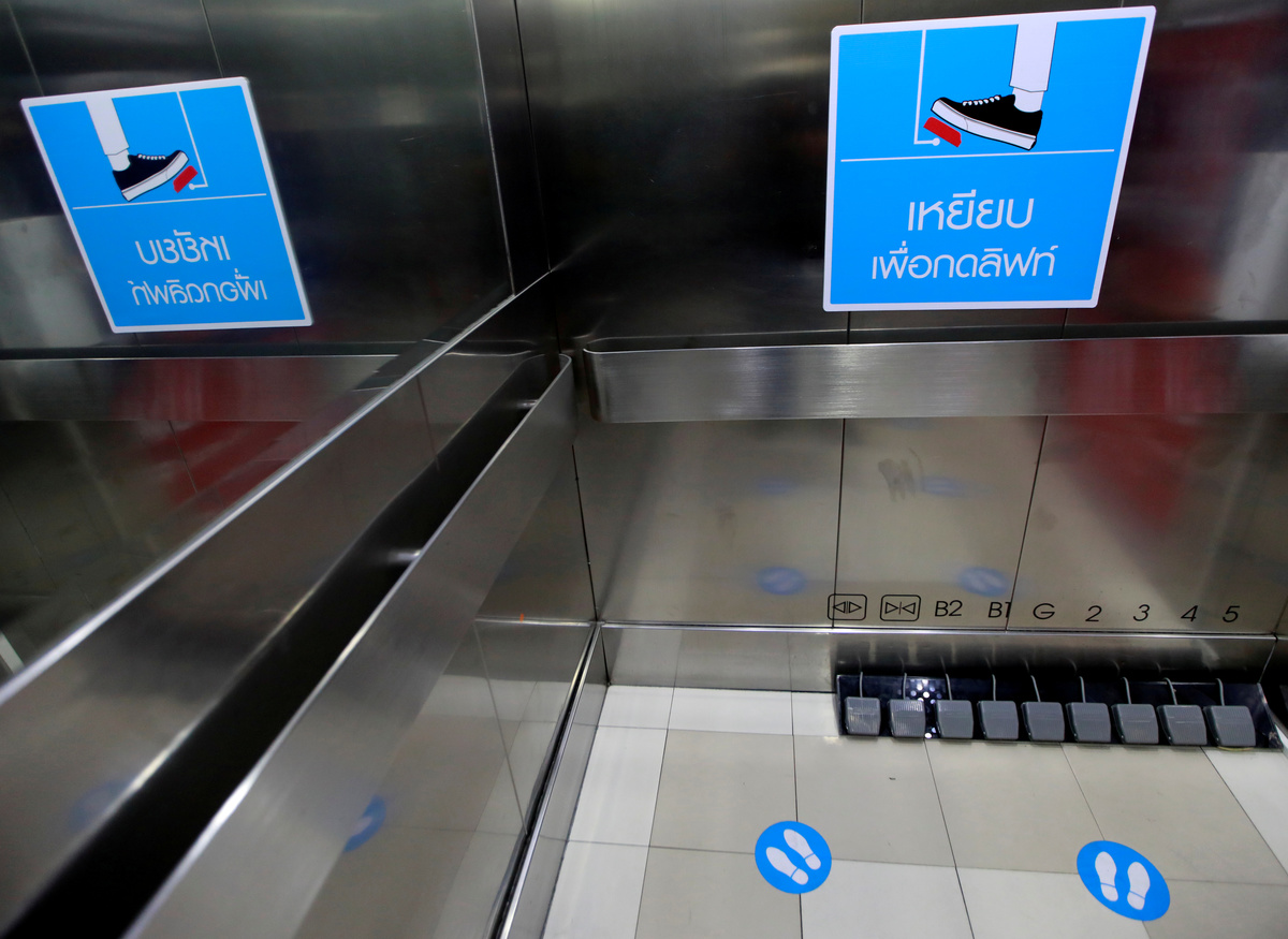 Customers at Bangkok's Seacon Square were surprised and confused this week to find pedals in front of the elevators and inside, but they welcomed the new hands-free enhancement as a smart move to stay healthy.