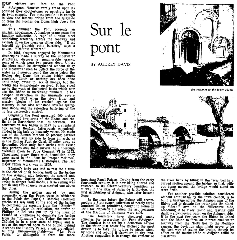 17 August 1965 The medieval Pont Saint-Bénézet, also known as the Pont d’Avignon, has been in ruins for years and various schemes are being discussed to preserve it. The bridge is well known thanks to the 15th century French song Sur le Pont d’Avignon.
