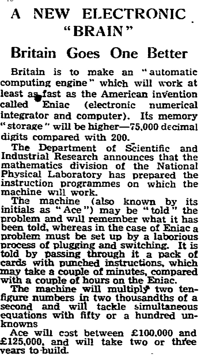7 November 1946: Britain is to make an “automatic computing engine” which will multiply two ten-figure numbers in two thousandths of a second.