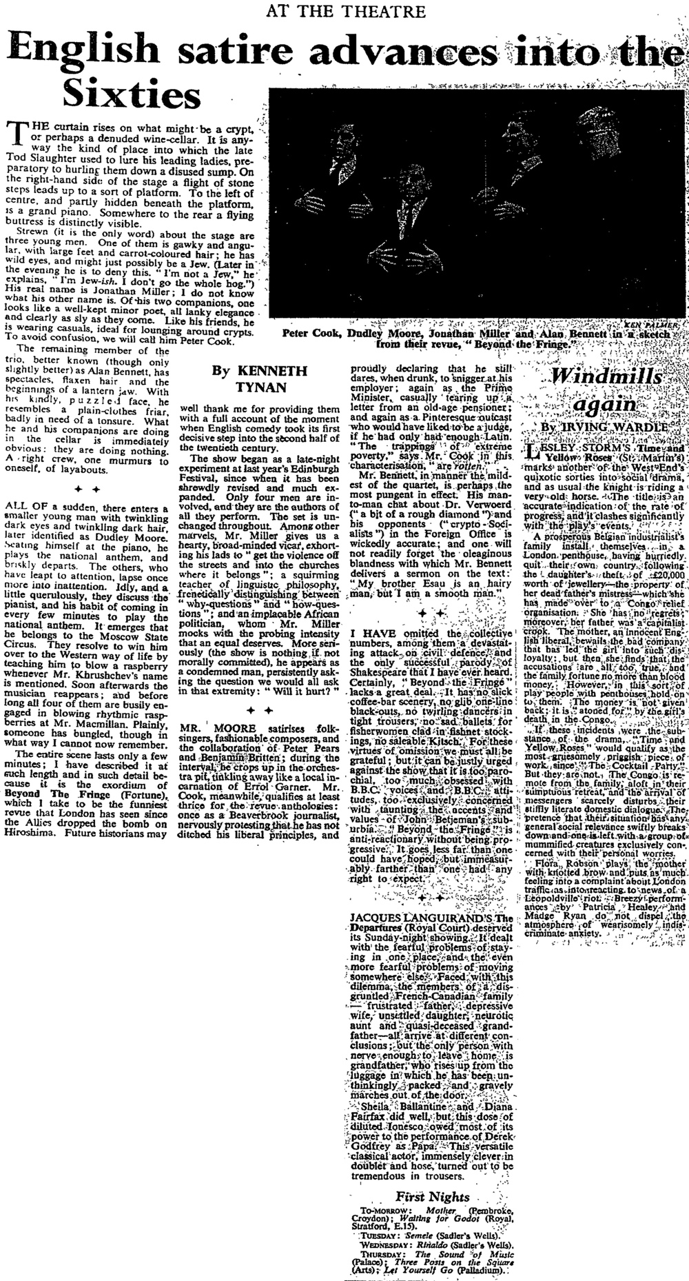 14 May 1961: English satire advances in to the 60s: Peter Cook, Dudley Moore, Jonathan Miller and Alan Bennett in “Beyond the Fringe.”