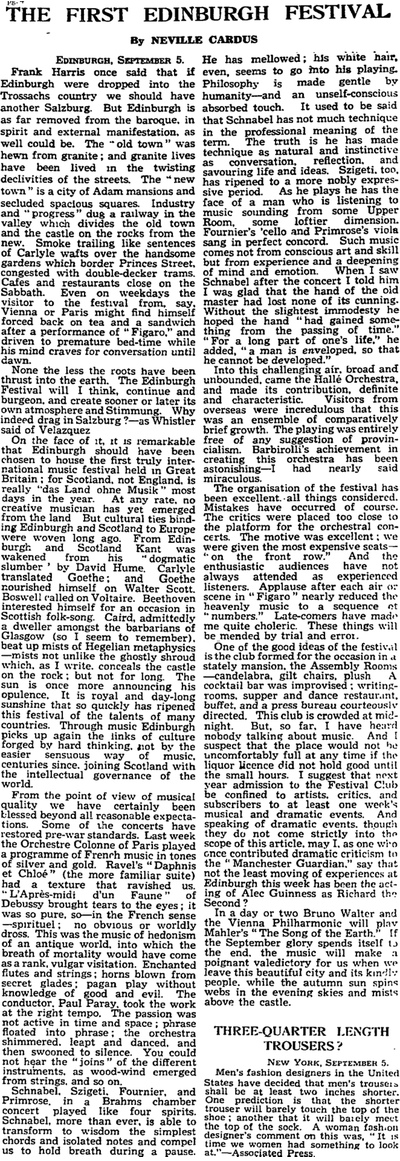 13 September 1947: Neville Cardus reviews Walter and the Vienna Philharmonic in Schubert and Mahler’s Das Lied von der Erde. “Music moved visibly on his face,” he writes of conductor Bruno Walter.