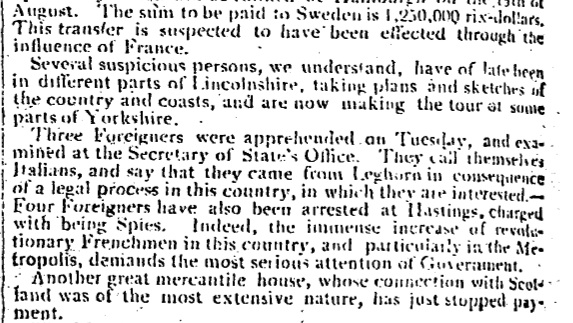 14 August 1803: As Napoleon wages war across Europe the Observer reports on the arrests of ‘suspicious persons’ across the UK.