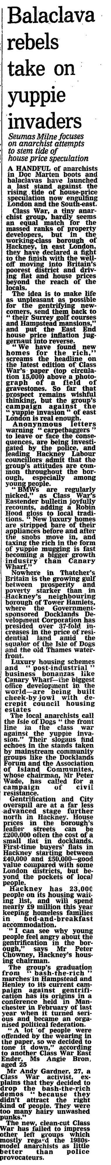 Some local people, fearing their local authority wasn’t doing enough to ease their fears over creeping gentrification, took matters into their own hands. In 1987, the Guardian reported that a small anarchist group, Class War, along with local activists, aimed to make life uncomfortable for the ‘yuppie invaders’ of Stoke Newington, north London.
