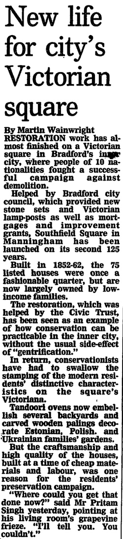 The thorny issue of gentrification wasn’t confined to London. In Bradford, in the 1980s, Southfields Square, a run down two-storey mid-Victorian square was saved thanks to locals working with the council. Gentrification had threatened to force out the poorer, diverse group of residents already living there.