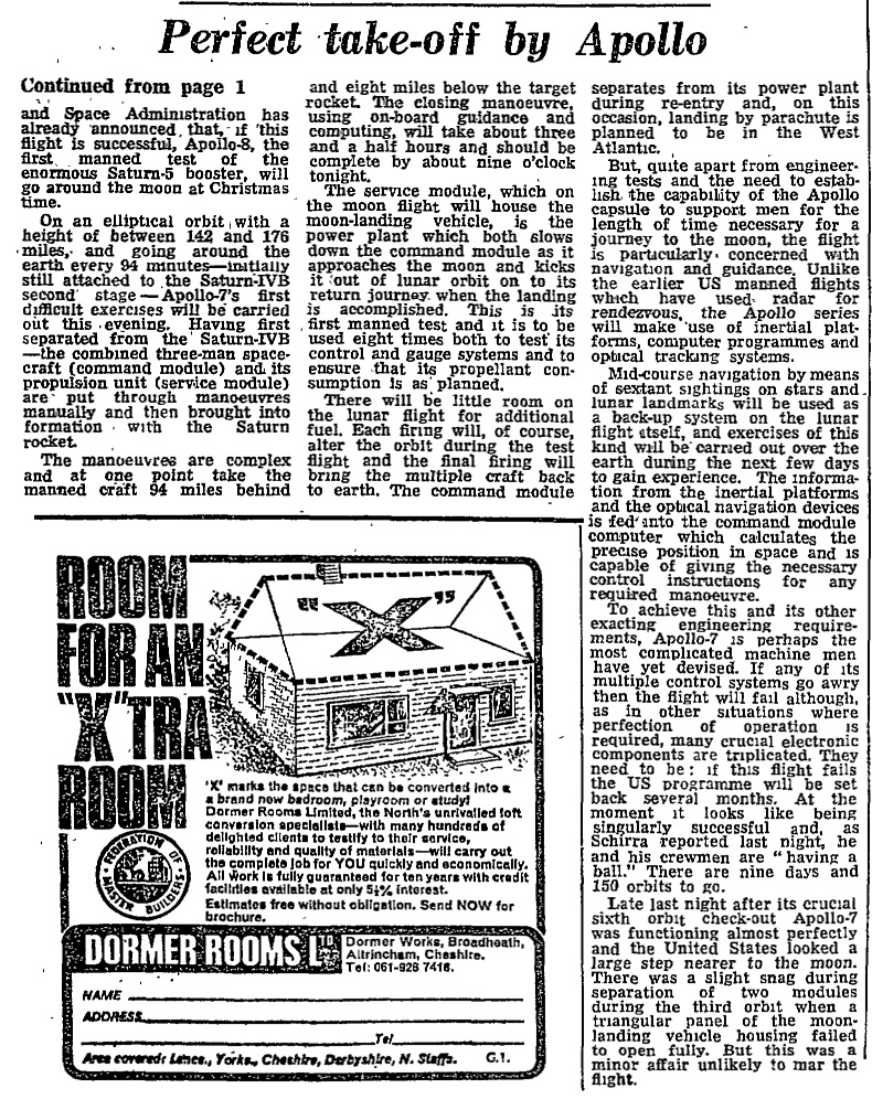 Perfect takeoff for Apollo 7 – first mission to carry a crew into space.