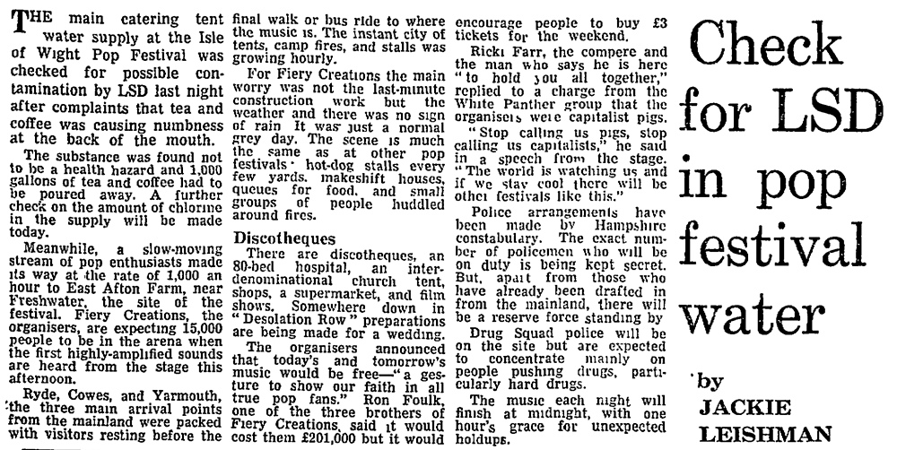 The water supply is checked for possible contamination by LSD after complaints that tea and coffee are causing numbness at the back of the mouth. Jimi Hendrix is the star of the festival which includes among others Joan Baez, Leonard Cohen, Jethro Tull, The Moody Blues, The Who, The Doors and Miles Davis.