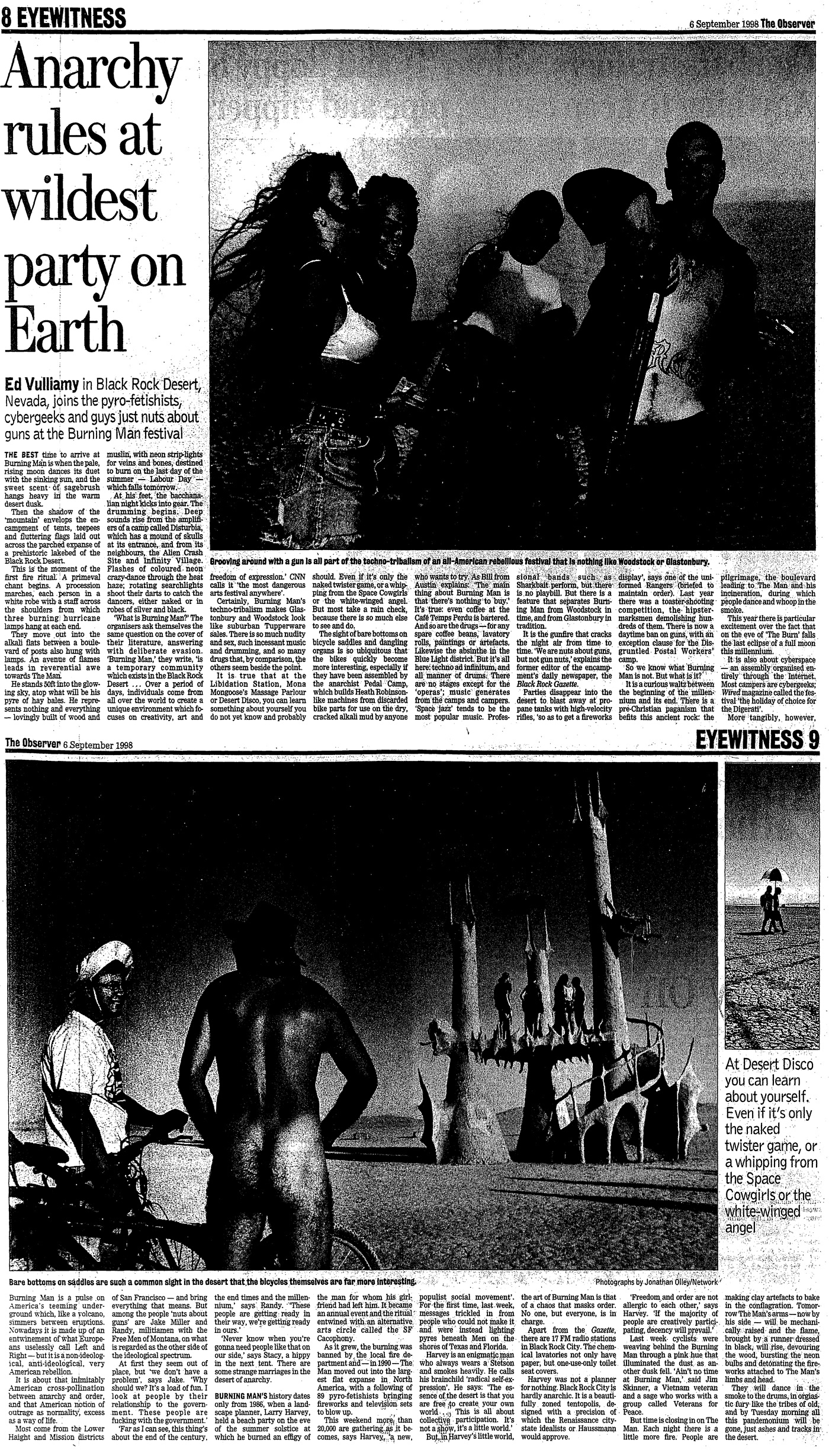 Anarchy rules at Burning Man, the wildest party on earth. The annual event started on a San Francisco beach in 1986 and moved to the Nevada desert in 1990. In 2003, a UK journalist spent a week reporting from Burning Man. The Guardian’s survival guide is here.